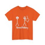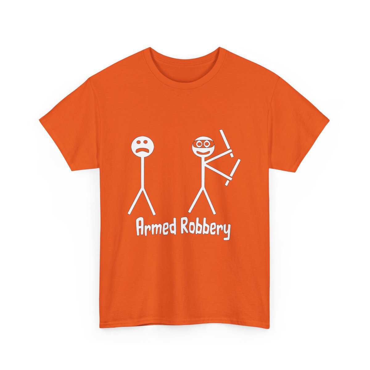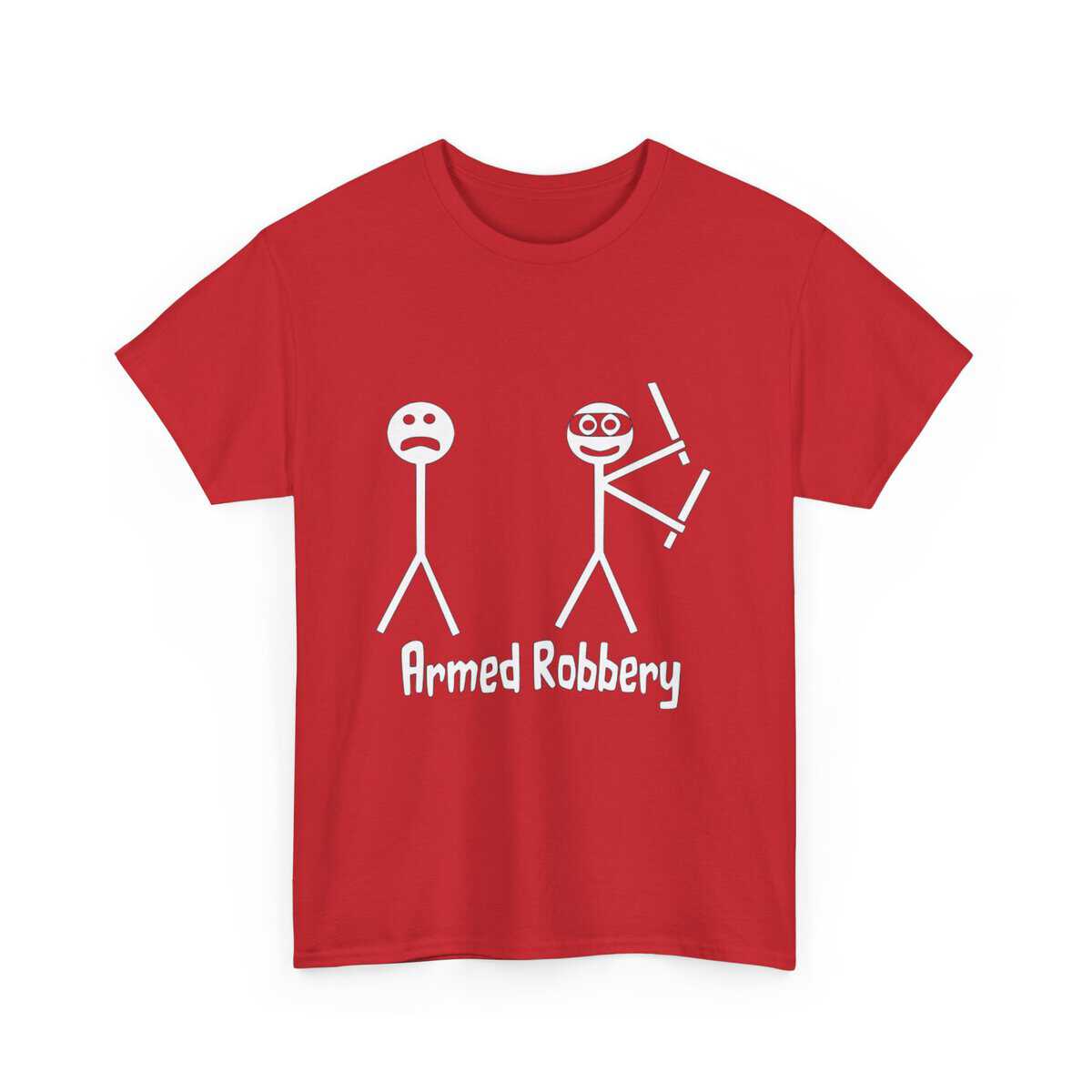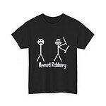 En morsom T-skjorte med to strekfigurer, der den ene holder den andres armer, og teksten «Armed robbery».