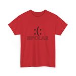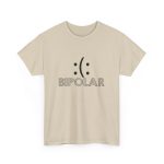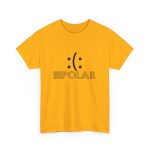 En morsom t-skjorte med et kombinert lykkelig/ulykkelig smil og teksten «Bipolar».