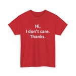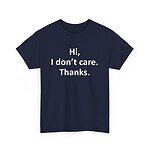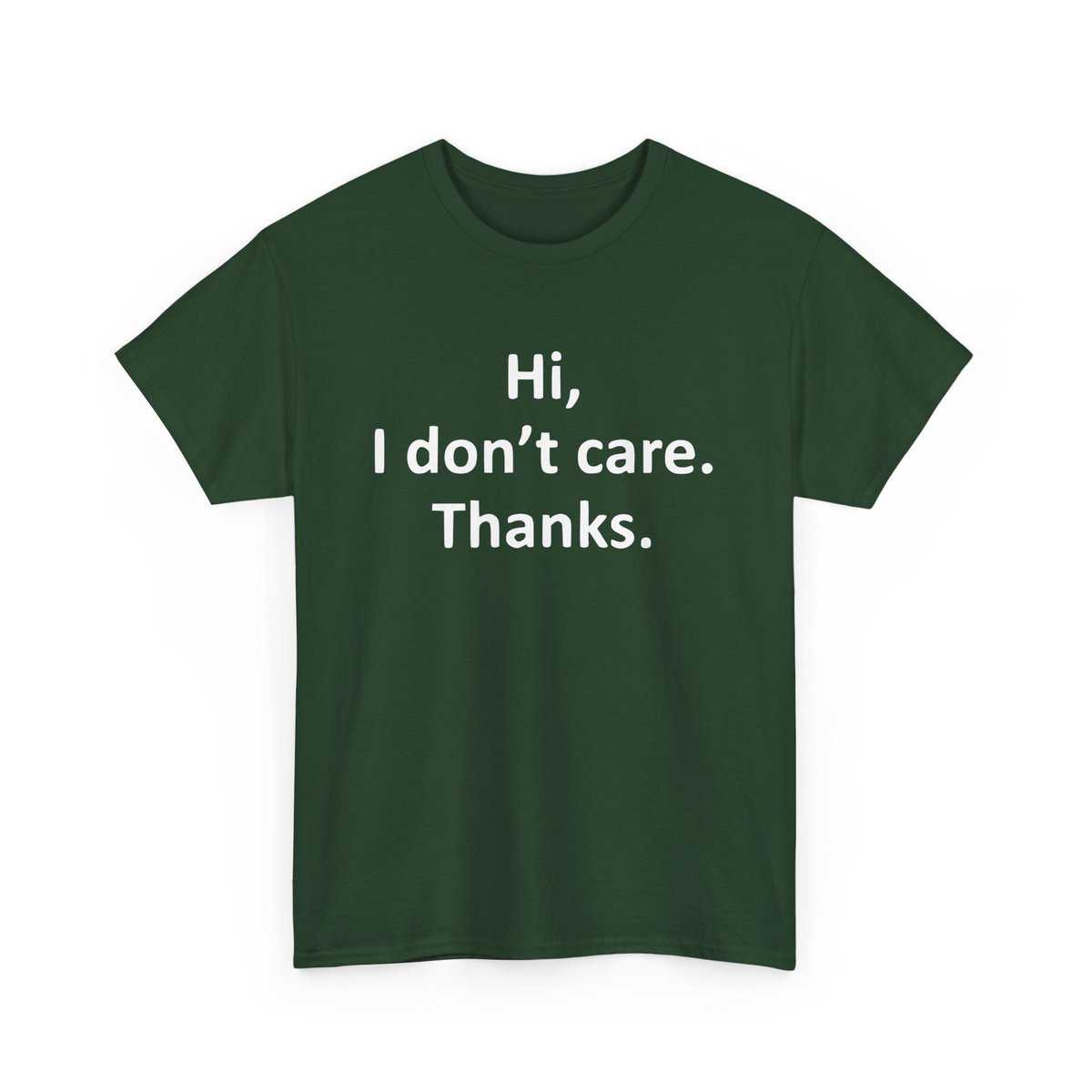 Denne T-skjorten har et enkelt, men frekt design som sier «Hi i dont care thx».
