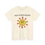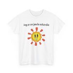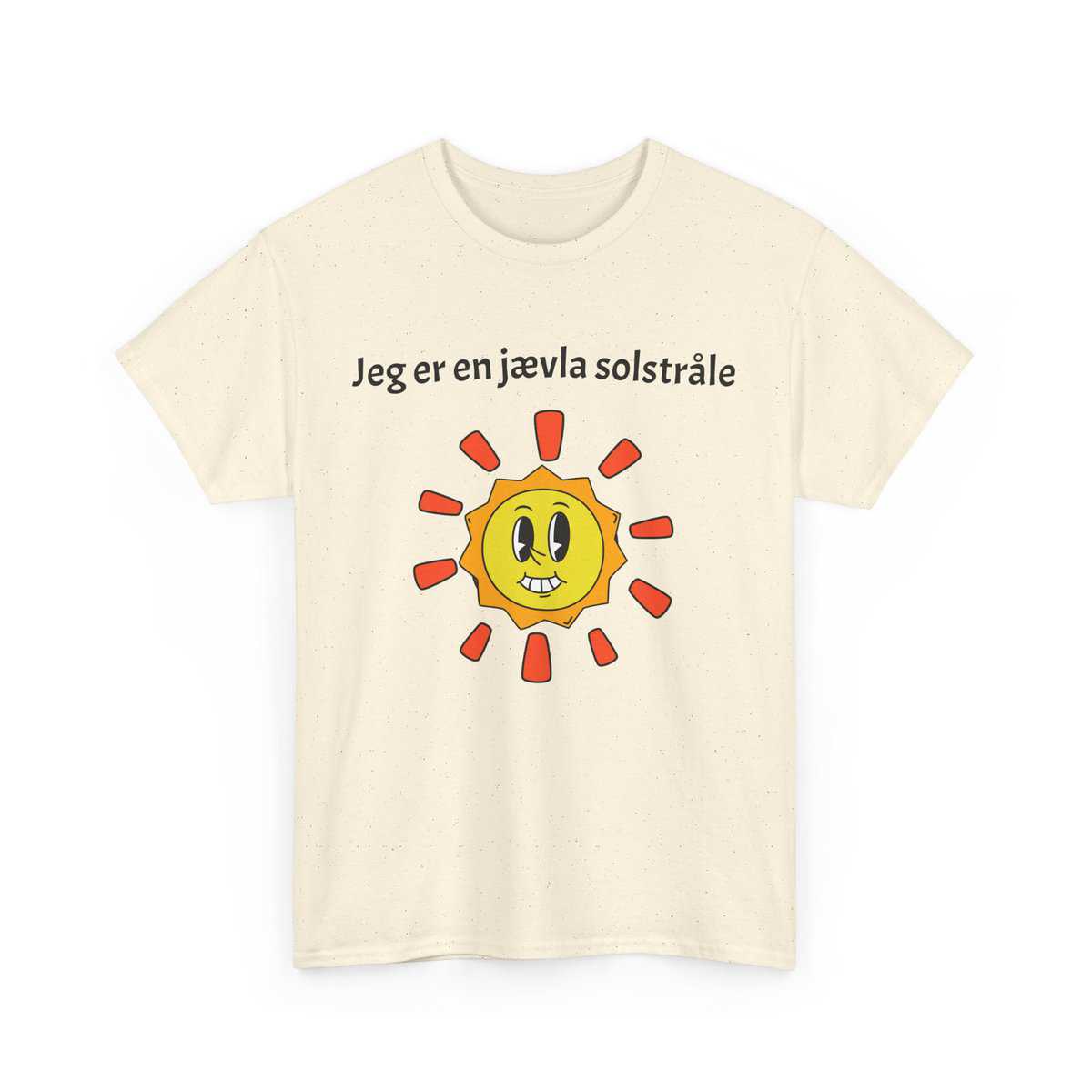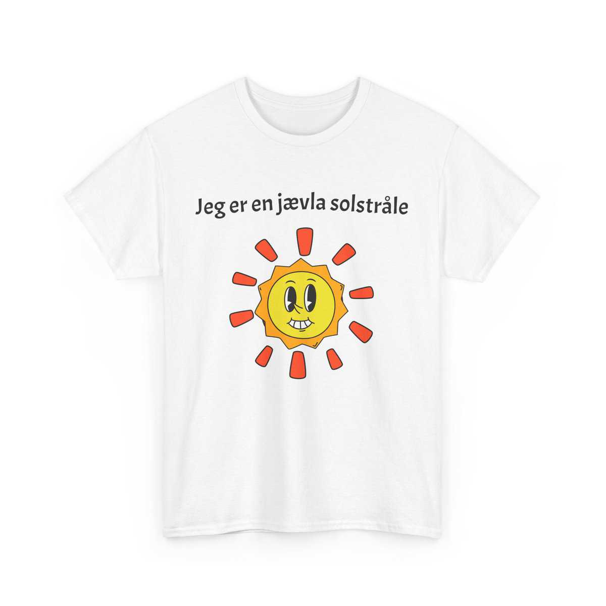 En sarkastisk t-skjorte med teksten «Jeg er en jævla solstråle».