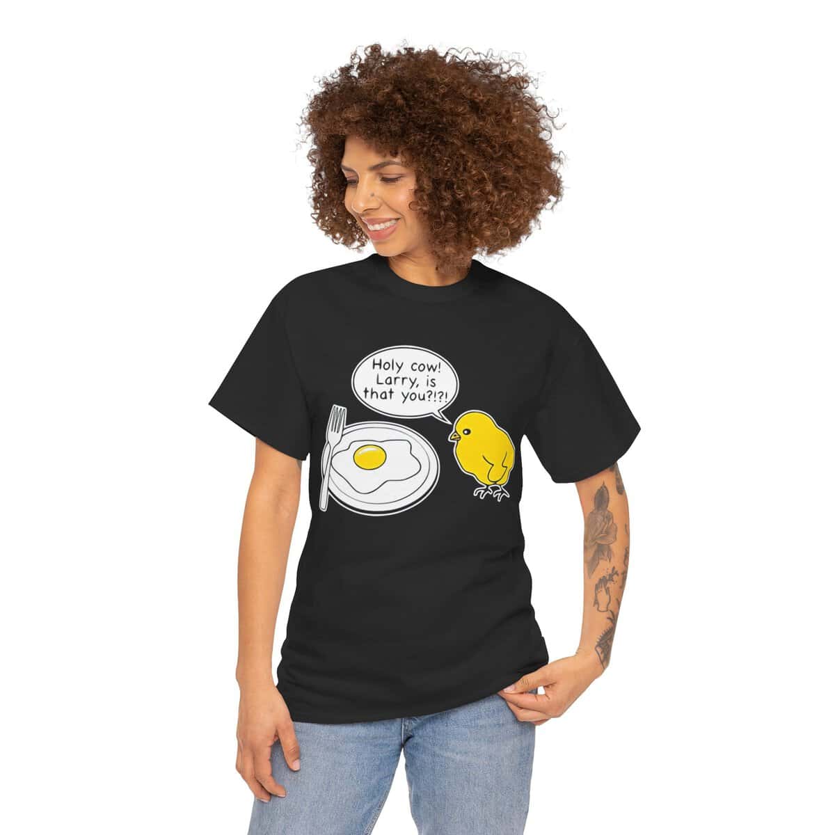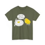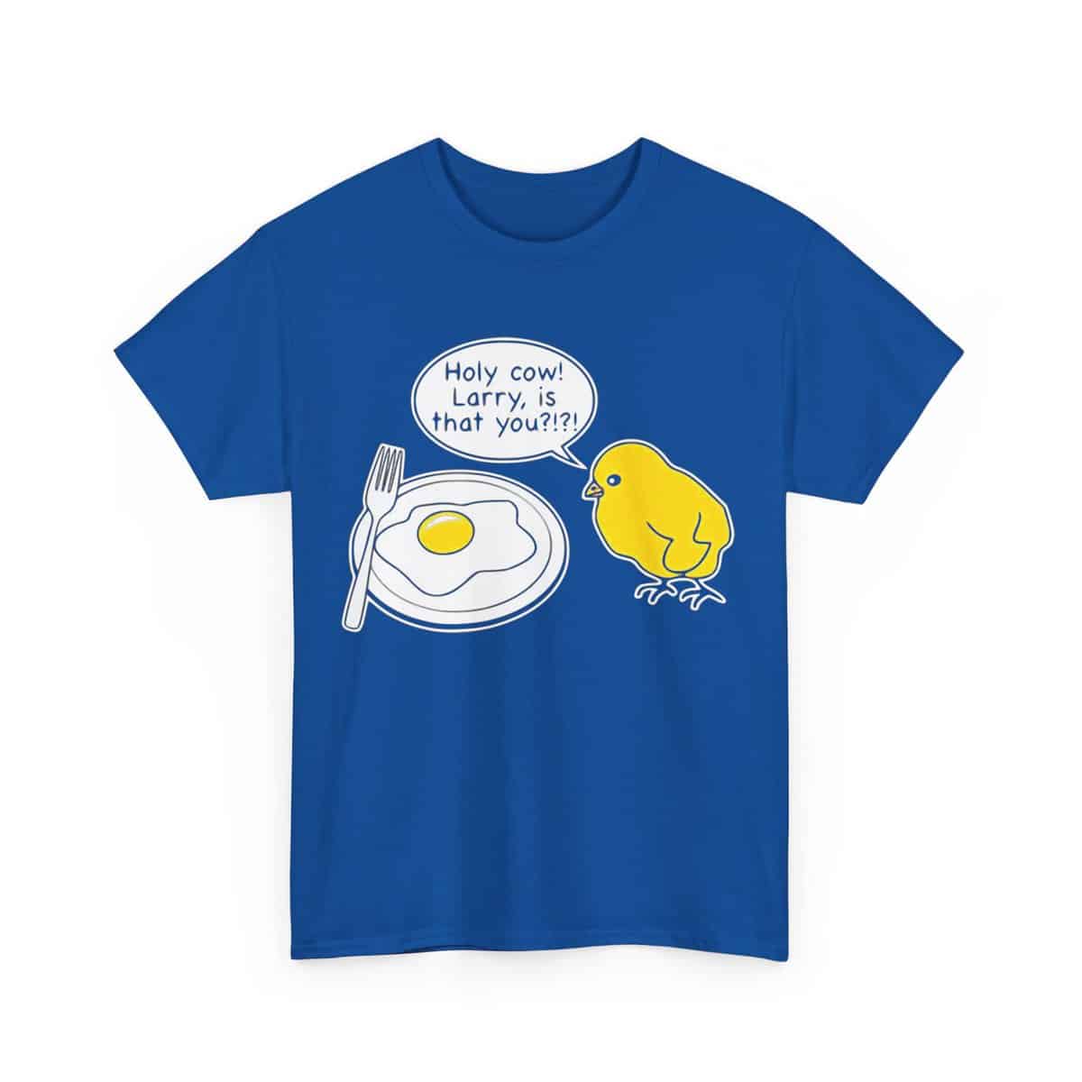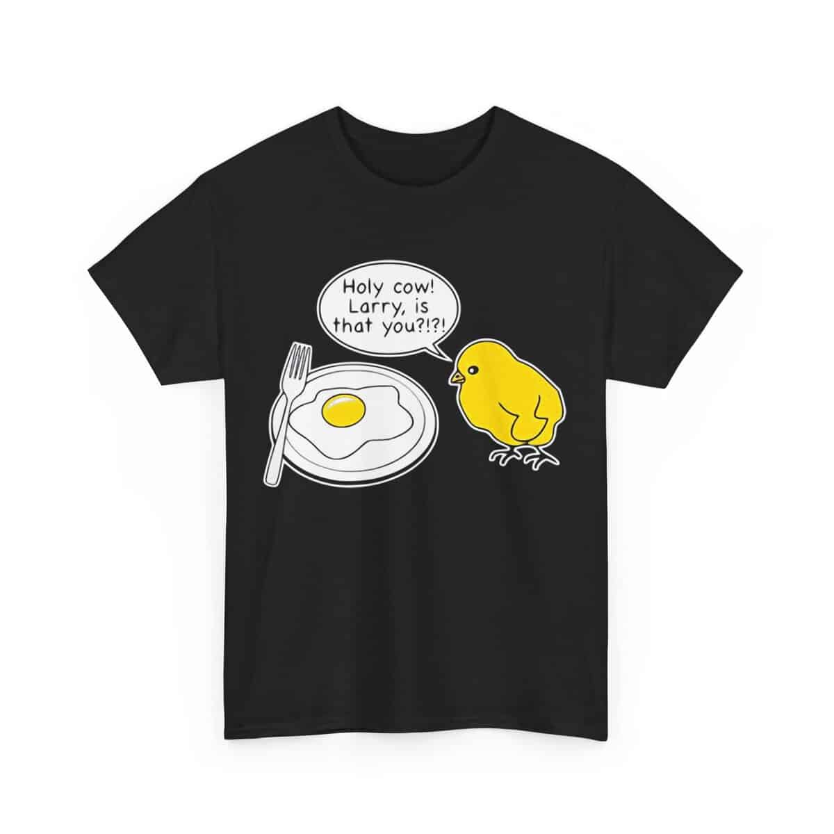Morsom t-skjorte med en kylling som ser et stekt egg og sier: Holy cow Larry, er det deg.