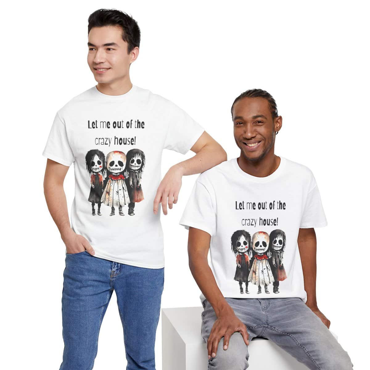 En unisex-tee i kraftig bomull med uttrykket «Let me out of the crazy house».
